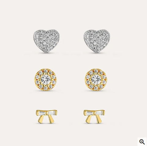 - Par 3 (furo 0,6 cm) – banho de ouro 18k com design de laço minimalista com zircônias tipo baguette, charmoso e delicado.